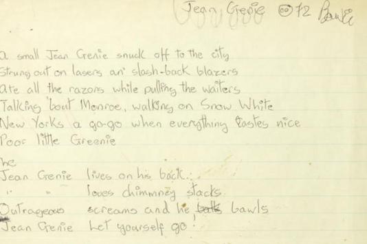 O manuscrito original da música The Jean Genie, escrito por David Bowie em 1972, vai a leilão em Londres, no dia 3 de julho - e pode alcançar mais de R$ 50 mil. A letra de The Jean Genie foi dada de presente pelo próprio Bowie a Neal Peters, presidente do seu fã-clube norte-americano. Escrito e gravado em Nova York, o single apareceu no disco Aladdin Sane, em 1973.