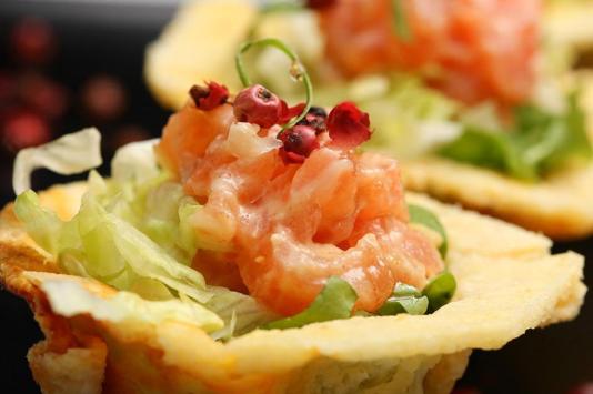 Entrada: cestas de parmesão com salmão, dijon e mel.