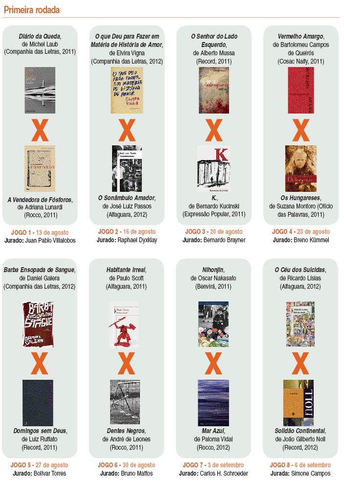 Na primeira fase da competição, 16 títulos se enfrentam em oito confrontos, livro contra livro: cada partida tem como juiz um crítico literário, que decide o vencedor em voto público e justificado – uma resenha, na verdade.