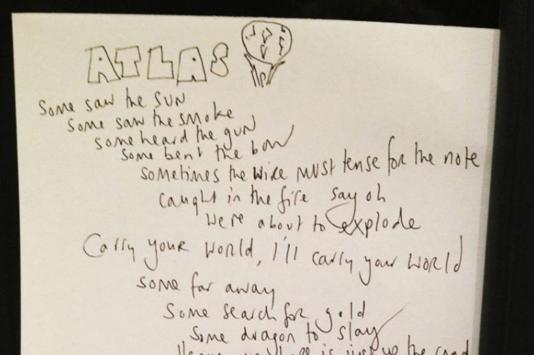 Até o fim de agosto, o Coldplay promete divulgar na internet uma nova música: Atlas, feita exclusivamente para a tilha sonora do filme Jogos Vorazes: Em Chamas. Nesta semana, a banda postou em suas redes sociais uma imagem do manuscrito da faixa, dando uma prévia de seu conteúdo.