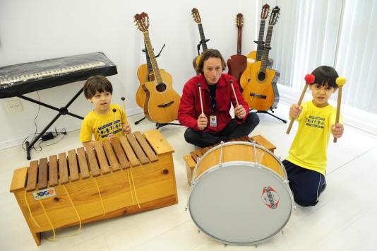 Meio-dia. Enquanto muitos se preparam para vencer os sinais de fome que o corpo começa a dar e almoçar, Felipe de Carvalho Luz e Fernando Faquere Sanches Moreira, de 6 anos, chegam afobados, às gargalhadas, à sala de música do Sesc Joinville para a turma de musicalização infantil. Nesse horário, apenas os dois estão matriculados – o que não significa um desafio pequeno para o experiente professor Fabio Fellipi.