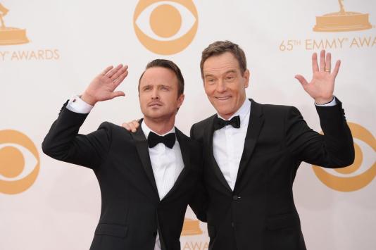 Aaron Paul e Bryan Cranston, da série "Breaking Bad", comemoraram o troféu recebido pelo programa, de melhor série dramática