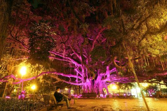 A Figueira da Praça XV de Novembro, em Florianópolis, recebeu uma iluminação rosa na noite desta terça-feira. A cor especial é alusiva ao Outubro Rosa, um movimento mundial com objetivo de alertar sobre os riscos do câncer de mama e a necessidade do diagnóstico precoce.
