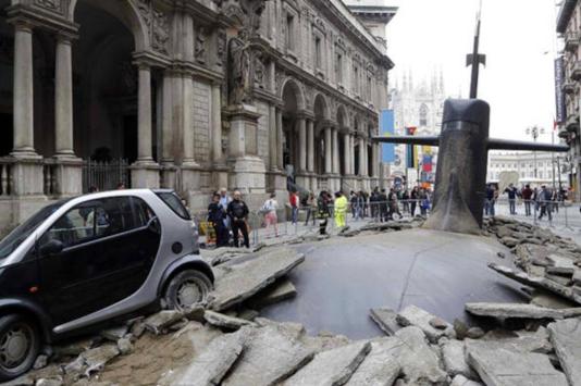 A torre de um submarino surgiu do chão na Via dei Mercanti, um das principais ruas do centro da cidade. Segundo a revista Exame, a cena catastrófica aconteceu de verdade, durante a noite, e deixou os habitantes intrigados.