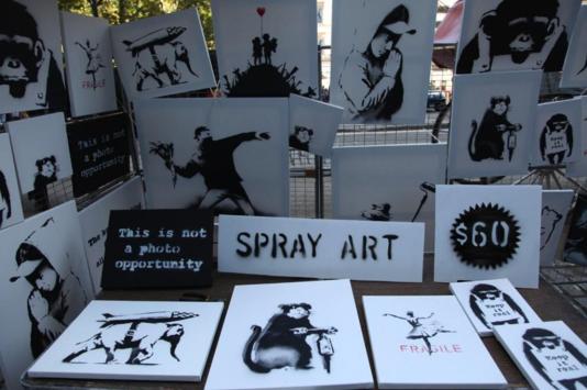 Banksy postou um vídeo em seu site mostrando um senhor em uma barraquinha vendendo telas suas supostamente falsificadas por apenas US$ 60. Acontece que o trabalho é original e cada tela é avaliada em no mínimo £ 20,000 (cerca de R$ 70 mil). Muitas das telas ficaram sem ser vendidas até o fim do dia. No total, o senhor acabou faturando um total de US$ 420.