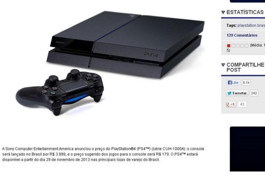 O anúncio feito hoje também informava o preço sugerido de R$ 179 para cada jogo. Às 10:45, a publicação no blog tinha 151 comentários e uma nota média de 1,06 - em escala de 1 a 5. Muitos dos "comentaristas" elogiavam ironicamente a estratégia da Sony, sugerindo que ela servirá para aumentar as vendas do concorrente Xbox One no país. O PS4 deve estar disponível em lojas brasileiras a partir do dia 29 de novembro.