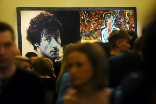 Stallone, de 67 anos, intérprete de lendários personagens no cinema de ação como Rocky e Rambo, apareceu sorridente na inauguração de sua mostra intitulada Sylvester Stallone. Arte. 1975-2013.