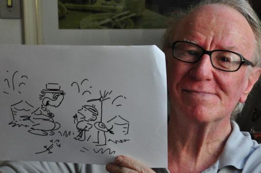 O cartunista Canini com um desenho em que uniu os personagens Zé Carioca e o Índio Tibica