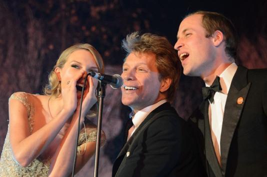 O príncipe William improvisou e cantou ao lado de Jon Bon Jovi e Taylor Swift em um noite de gala organizada na terça-feira em Londres em favor de uma organização de caridade.
