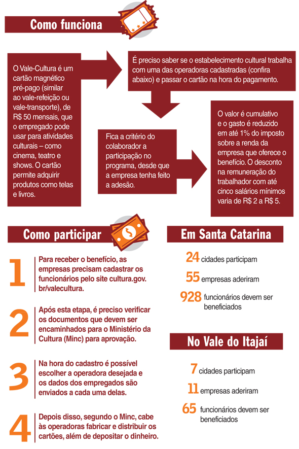Quase quatro meses se passaram desde o início dos cadastros para a utilização do Vale-Cultura pelas empresas de todo o país, mas apenas 1.297 solicitaram o benefício ao Ministério da Cultura (Minc). Em Santa Catarina — que, segundo o Censo de 2012, tem mais de 500 mil empreendimentos em funcionamento — este número é ainda menor: só 55 empresas aderiram. Onze delas ficam no Vale do Itajaí, que corresponde a somente 0,84% das empresas beneficiadas no Brasil inteiro.