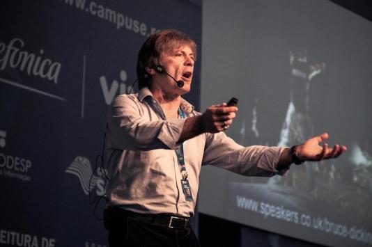 Se a atriz Christiane Torloni estivesse na Campus Party nesta terça-feira, certamente diria: hoje é dia de rock, bebê! Afinal, foi ao som de um clássico do heavy metal que o vocalista da banda Iron Maiden, Bruce Dickinson, subiu ao palco do Anhembi Parque, em São Paulo, para falar de empreendedorismo a jovens geeks.