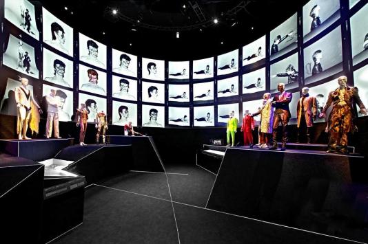 O videohall gigante da sala principal da exposição apresenta momentos emblemáticos da carreira de David Bowie