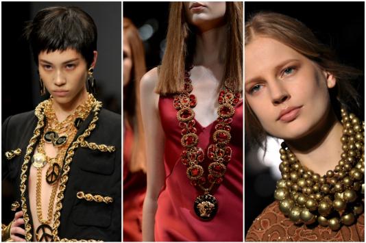 Seguindo o estilo nada básico da grife, os correntões dourados brilharam na passarela da Versace. Além da aplicação de pedrarias, os modelos da direita e da esquerda também ganharam pingentes generosos. O colar do meio dá várias voltas ao redor do pescoço e ainda ganhou a companhia de ombreiras no mesmo tom. Tchau, discrição!