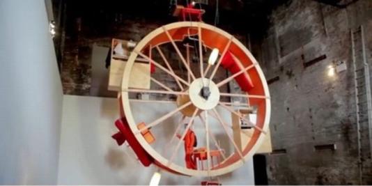 A dupla de artistas performáticos Ward Shelley e Alex Schweder está passando dez dias em uma espécie de "roda de hamster" gigante criada em Nova York, nos Estados Unidos. Na instalação giratória de 25 metros de altura, feita de madeira e chamada de "In Orbit", eles comem, dormem e fazem as necessidades fisiológicas.