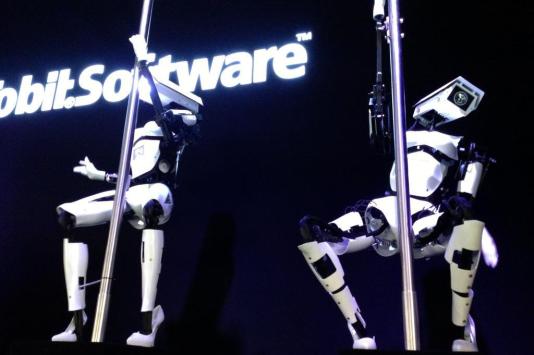 As duas máquinas rebolam em um pole dance no palco, enquanto os clientes do bar, localizado em um dos centros de exposições, confraternizam. Contrastando com o ambiente iluminado da feira, o lounge tem pouca luz e música animada, dando a sensação que o visitante está mesmo em uma casa noturna. As pick ups também são controladas por máquina. O DJ não passava de humanoide.