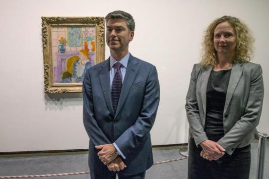 Christopher A. Marinello, membro da família Rosenberg, e Tone Hansen, diretora da galeria Henie Onstad, posam em frente do quadro "Profil Bleu Devant la Cheminée", do francês Henri Matisse