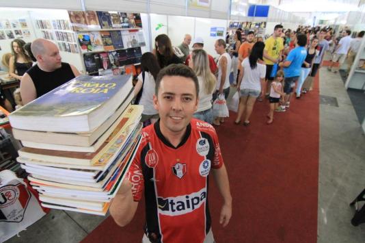 O expositor Daniel da Silveira, 28 anos, conta que participa da feira desde a época em que ela acontecia na praça Nereu Ramos. Enquanto aproveitava o último dia para vender livros e divulgar o seu sebo, Daniel também acompanhava o jogo do Joinville pela final do Catarinense, vestido à caráter.