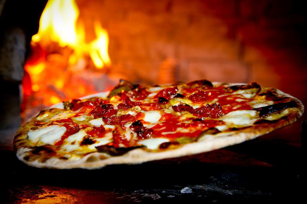 • Distribua em cima da massa as fatias de berinjela, a mozarela de búfala, o molho de tomate, o tomate seco e leve ao forno a lenha aquecido a 400ºC por três minutos.