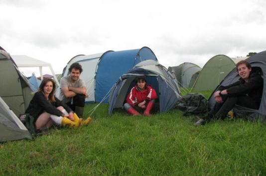 Miguel Schertel (segundo à esquerda) com amigos no acampamento do festival Glastonbury, na Inglaterra