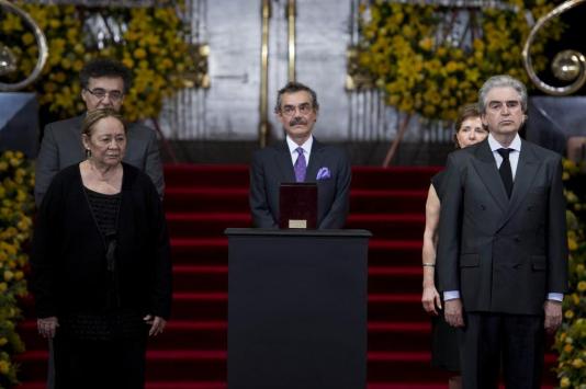 Viúva de García Marquez, Mercedes Barcha (à esquerda na foto), olha para a urna contendo as cinzas do autor durante tributo nesta segunda-feira