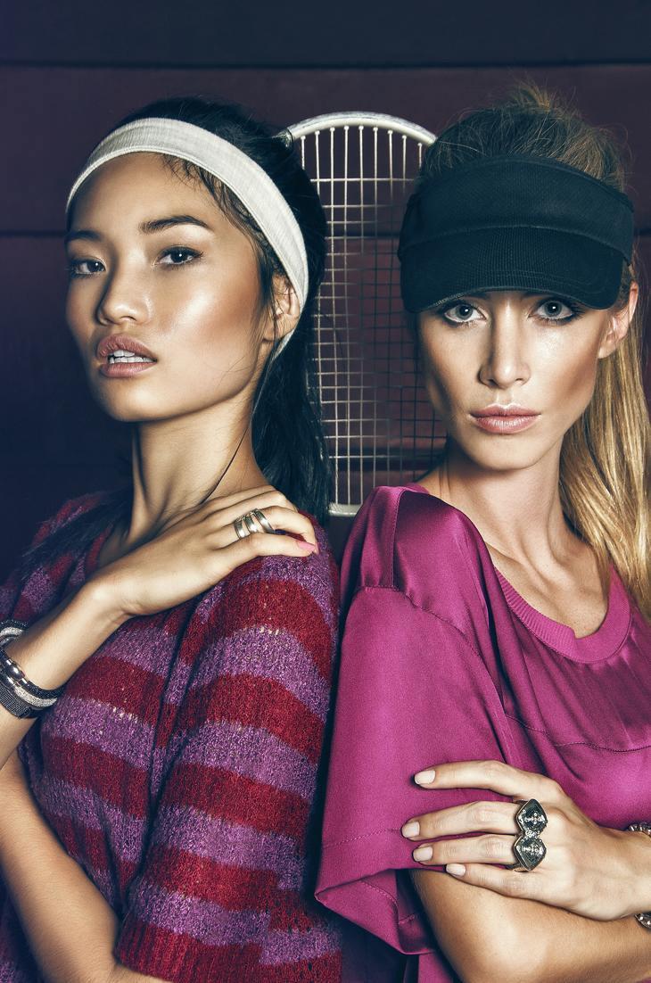 Cintya usa tricô Maria Filó, faixa Acessorize e pulseiras e anéis Strass. À direita, Myrella veste blusa Maria Filó, viseira acervo e pulseira e anéis Strass.