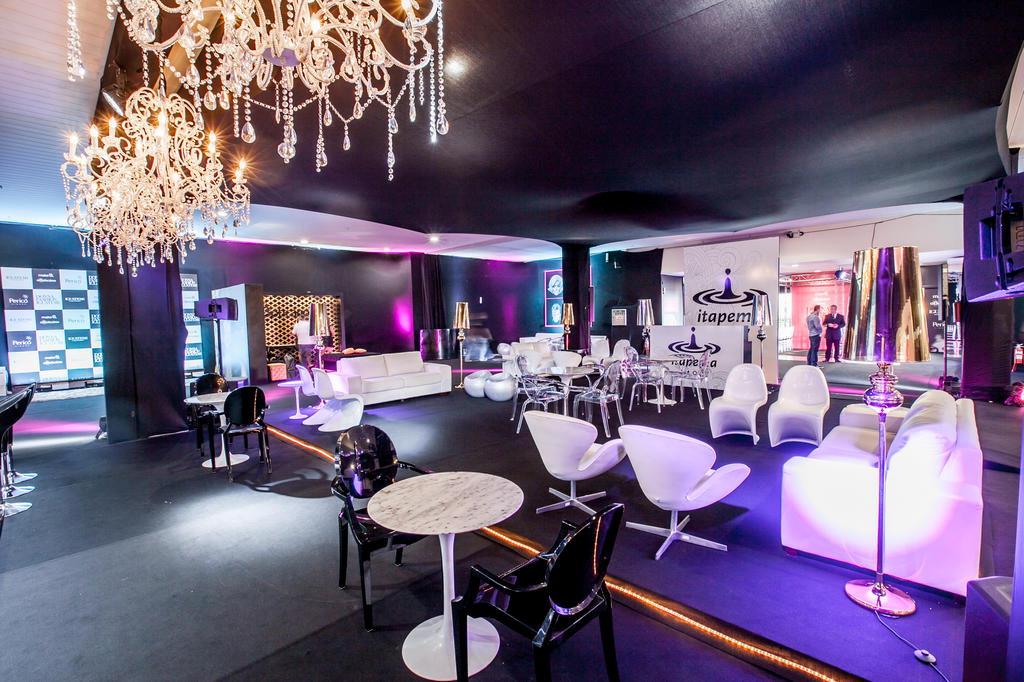 Depois da entrada triunfante, o público encontrava um lounge todo em preto e branco, com móveis de design fornecidos pela Peça as Peças, especializada em locação de móveis e materiais para festas, e pela marcenaria Vilano.