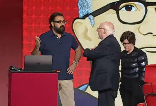 Vice-presidente corporativo do Skype, Gurdeep Pall (E), faz demonstração do Skype Translator durante evento em Rancho Palos Verdes, na Califórnia