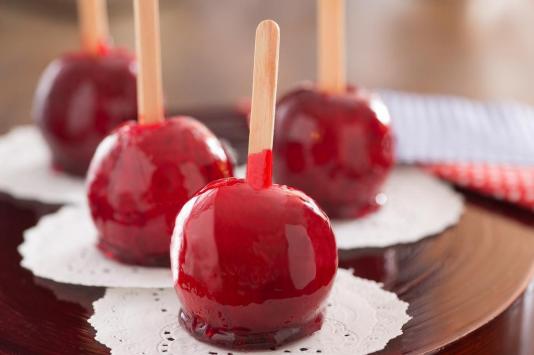 Lave e seque as maçãs. Espete um palito no centro da maçã, até que fique bem firme, e reserve. Em uma panela, junte a água, o açúcar, o xarope de glicose e o corante. Leve ao fogo baixo, sem mexer, até alcançar ponto de fio grosso. Para testar o ponto da calda, pingue um pouco em uma tigela com água fria. Deverá formar fios duros. Quando atingir o ponto da calda, retire-a do fogo e segure cada maçã pelo palito e mergulhe rapidamente na calda, cobrindo toda a fruta. Deixe escorrer o excesso e coloque numa assadeira untada com margarina, para não grudar. Deixe esfriar e endurecer.