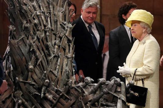 Parece que o Trono de Ferro, o assento dos reis dos Sete Reinos de Westeros, tem uma nova postulante: Rainha Elizabeth II e o Príncipe Philip visitaram nesta terça o set de filmagens da série Game of Thrones. No estúdio localizado em Belfast, na Irlanda do Norte, a Rainha posou para fotos e conversou com os atores Lena Headey, Maisie Williams, Sophie Turner, Kit Harington, Rose Leslie e Conleth Hill. Os produtores David Benioff e Dan Weiss, responsáveis por adaptar os livros de George R. R. Martin para a televisão, foram os guias turístico da majestade pelo set.