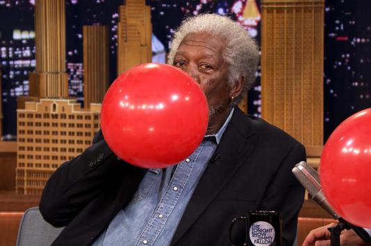 Mas, quem senta na cadeira do entrevistado no programa The Tonight Show, de Jimmy Fallon, não sai vai embora sem antes pagar um mico básico. E a ~vítima~ da vez foi Freeman que, na última quinta, 24, ingeriu gás hélio e transformou sua voz imponente em uma fala bem fininha.