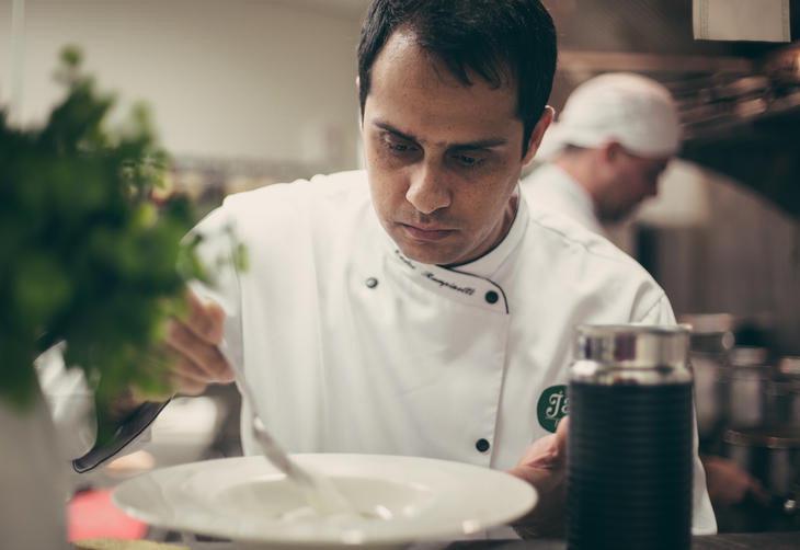 Na cozinha, o chef comanda o grupo que o auxilia na execução do cardápio. Todos os pratos têm como foco ingredientes locais e sabores familiares, trabalhados com um toque pessoal.