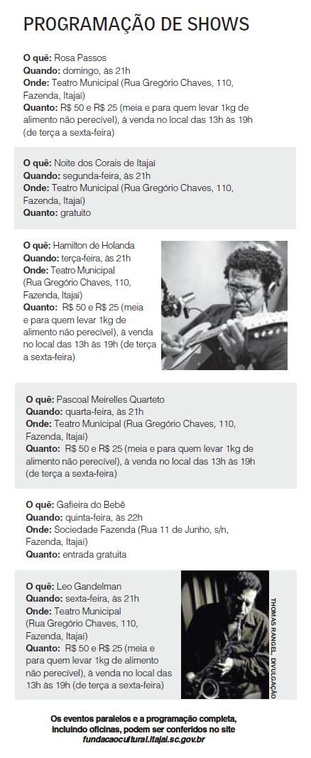 Marcado para 20h de sábado e com entrada gratuita para a pista, o show nacional é o primeiro do evento em Itajaí, que continua com atrações até 13 de setembro. Nas noites seguintes se apresentam no Teatro Municipal Rosa Passos, Noite dos Corais, Hamilton de Holanda, Pascoal Meirelles Quarteto e Leo Gandelman. A exceção é a dança de salão da Gafieira do Bebê — uma das novidades deste ano—, que ocorre na Sociedade Fazenda (veja a programação na tabela).Atividades
