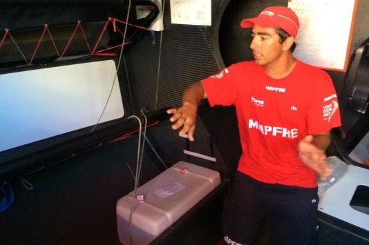 Bochecha convidou os jornalistas que acompanham a comitiva de Santa Catarina em Alicante, na Espanha, para uma visita ao barco da equipe Mapfre, no qual ele vai correr a regata a partir de sábado. Macas móveis fazem o papel de cama. A possibilidade de movimentar a maca existe para que o atleta são seja jogado para fora da cama em dias de mar muito agitado.
