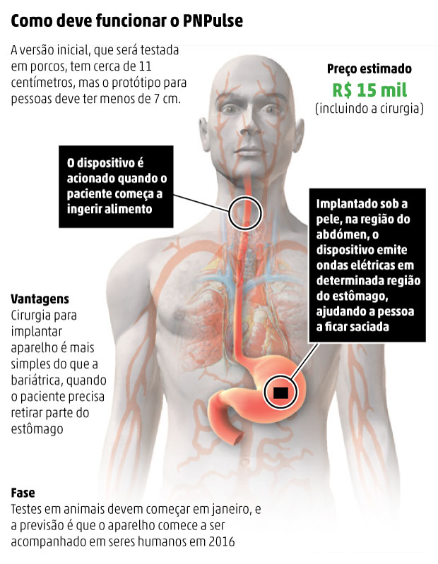 – Os resultados para a perda de peso devem ser idênticos a uma cirurgia bariátrica. A diferença é que esse procedimento é mais barato, custaria cerca de R$ 15 mil, e menos invasivo. O aparelho é colocado com uma operação subcutânea (embaixo da pele) – diz Pavei.