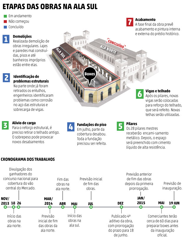 Quem passa pelo Mercado Público de Florianópolis e desconfia que as obras estão perto do fim pode começar a acompanhar no calendário: a prefeitura deu 19 de junho como data para finalizar a reforma da ala sul. Hoje, restam cem dias para o prazo final acertado no último aditivo de restauro do espaço. Oitenta homens trabalham para que, na data prevista, o prédio esteja à disposição dos comerciantes para instalação dos boxes, informa o secretário da Administração municipal, Gustavo Miroski.
