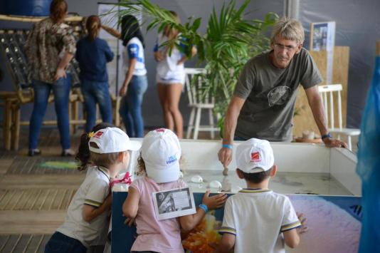 Crianças observam estrelas do mar em tanque que simula ecossistema de uma praia no Espaço Sustentabilidade
