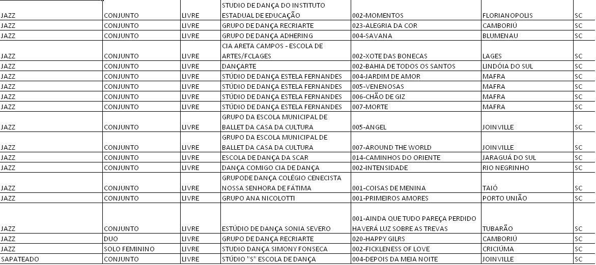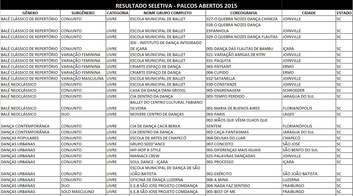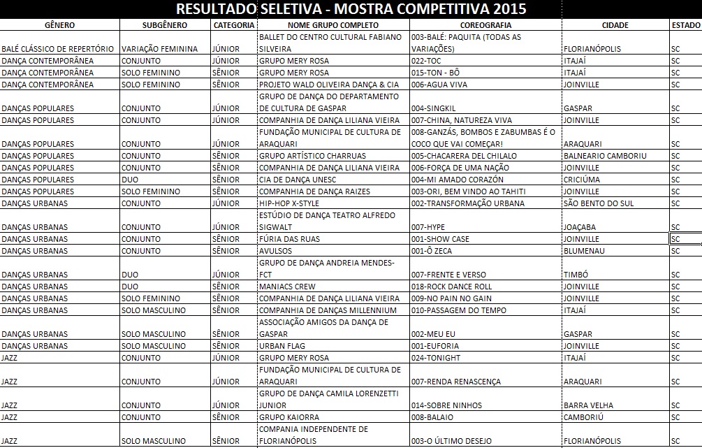 Dos 104 selecionados, 21 grupos são catarinenses e aprovaram 26 coreografias. Eles representam os municípios de Araquari, Balneário Camboriú, Barra Velha, Blumenau, Camboriú, Criciúma, Florianópolis, Gaspar, Itajaí, Joaçaba, Joinville, São Bento do Sul e Timbó. Joinville tem o maior número de grupos selecionados entre os municípios catarinenses. São seis grupos _ dois a mais que no ano passado -, que classificaram oito coreografias. Três destas são da Companhia de Dança Liliana Vieira. De Itajaí, outro grupo que emplacou três coreografias é o Grupo Mery Rosa.
