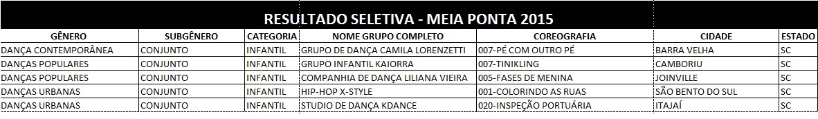 No festival infantil Meia Ponta, os 32 trabalhos selecionados são da Bahia, Ceará, Minas Gerais, Paraíba, Rio Grande do Sul, Santa Catarina e São Paulo, incluindo mais um grupo da Argentina e um do Paraguai. Para as apresentações nos Palcos Abertos, foram aprovadas 249 coreografias, de 134 grupos. Santa Catarina estará representada por 44 coreografias. A lista completa das coreografias e grupos aprovados para o 33º Festival de Dança de Joinville está disponível no sitewww.festivaldedanca.com.br, no ícone "resultado".