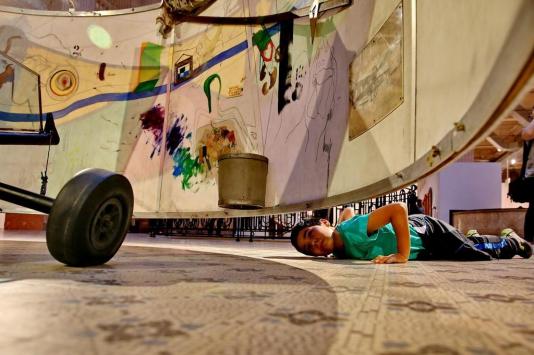Foto: Júlio Cordeiro, Agência RBSTambém há obras que não convidavam a um mergulho tão literal. No Santander Cultural, Helicóptero, de Wesley Duke Lee, traz um girocóptero envolto por uma estrutura circular. Não dá para ver o equipamento sem um pouco de esforço, o que não foi problema para o menino José Grossi, 11 anos: encorajado pela mãe, ele colou o rosto no chão e espiou pela fresta sob a instalação.