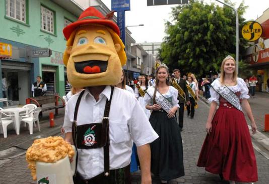 Jaraguá do Sul praticamente parou na manhã deste sábado para acompanhar o o desfile de lançamento da 20ª edição da principal festa turística da cidade, a Schützenfest. Mesmo com o tempo nublado, os grupos representando 20 sociedades de tiro levaram a alegria para o centro da cidade. O desfile terminou na praça Ângelo Piazera, onde foi erguido o mastro que representa a festa da colheita, ou a Schützenbaum.