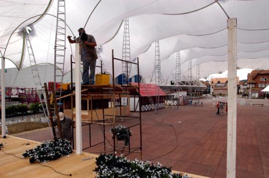 Sob uma tenda branca, sete boxes de madeira foram erguidos e agora recebem os acabamentos finais, como pintura e cobertura de lona. Cada um deles terá 30 metros quadrados. Dois deles abrigarão choperias — Eisenbahn e Brahma — enquanto os outros cinco terão opções de gastronomia, que incluirão desde batata recheada a cachorro quente.