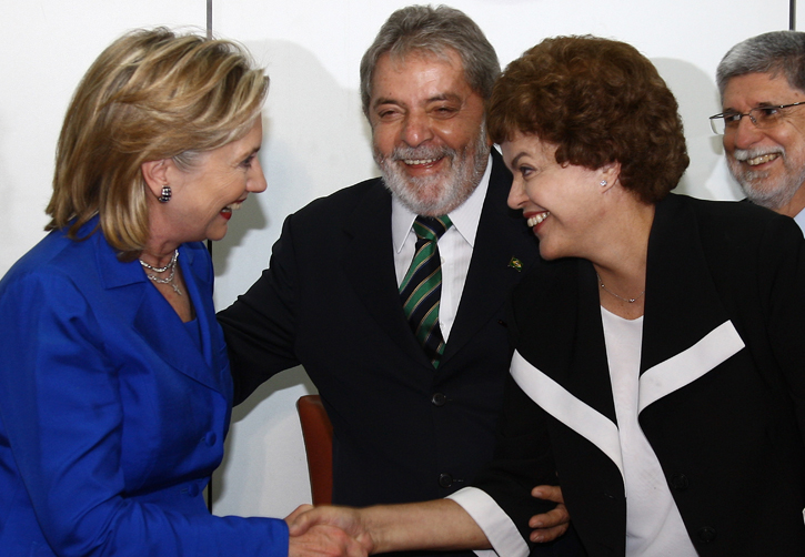 Dilma Rousseff com Hillary Clinton, secretária de Estado dos EUA, sob olhar de Lula e do ministro de Relações Exteriores do Brasil, Celso Amorim