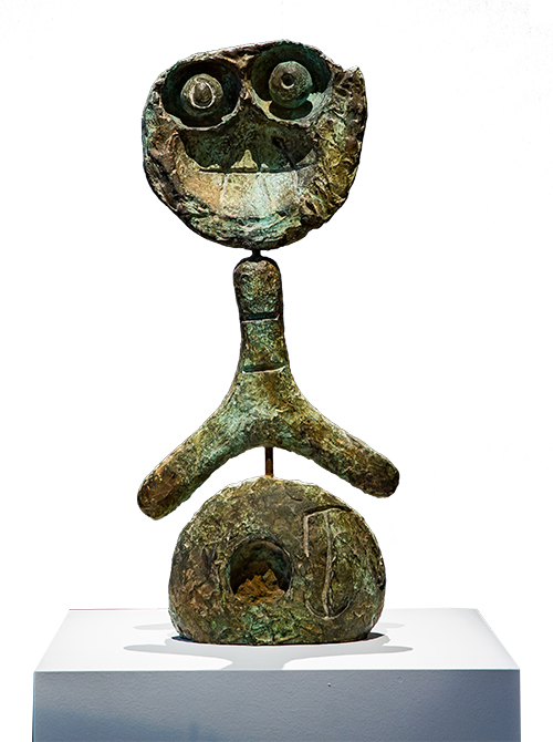 Depois de 1944, quando começa a trabalhar com cerâmica, Miró segue renovando não só o modo de pintar, mas também a linguagem. Vê-se o interesse pela experimentação da matéria e ele realiza um trabalho profícuo de esculturas. Na exposição aparecem muitas de seus trabalhos em bronze, aparentemente uma técnica pouco convidativa se comparada a outras utilizadas por ele. A espontaneidade e agilidade, traços característicos de seu fazer artístico, fazem com que ele enxergue em elementos banais, como sucatas, tampas de panelas ou tijolos, figuras como o corpo de uma mulher ou de pássaros.
