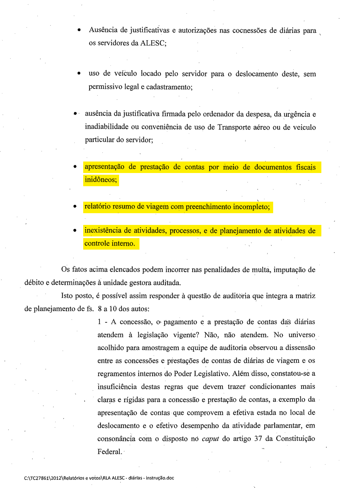 Auditores analisaram despesas da assembleia com diárias de deputados e servidores entre janeiro de 2009 e junho de 2011. O documento detalha casos de deputados que fizeram viagens internacionais com justificativas que, de acordo com o levantamento do TCE, não teriam cumprido o Regimento Interno, ou seja, não tiveram autorização prévia da mesa diretora. A investigação também cita notas fiscais de despesas com comprovantes considerados pela auditoria como “inidôneas”, com número de série sequencial ou com preenchimento irregular. Foi apontada ainda a falta de argumentação para explicar a função parlamentar das viagens.