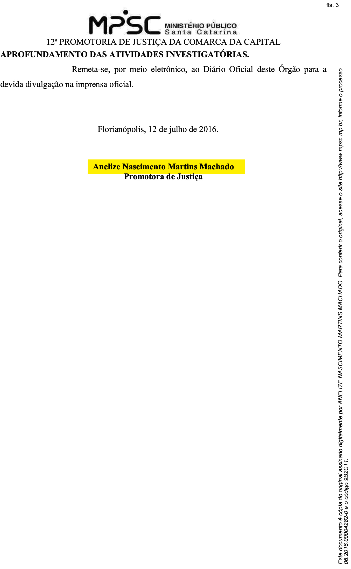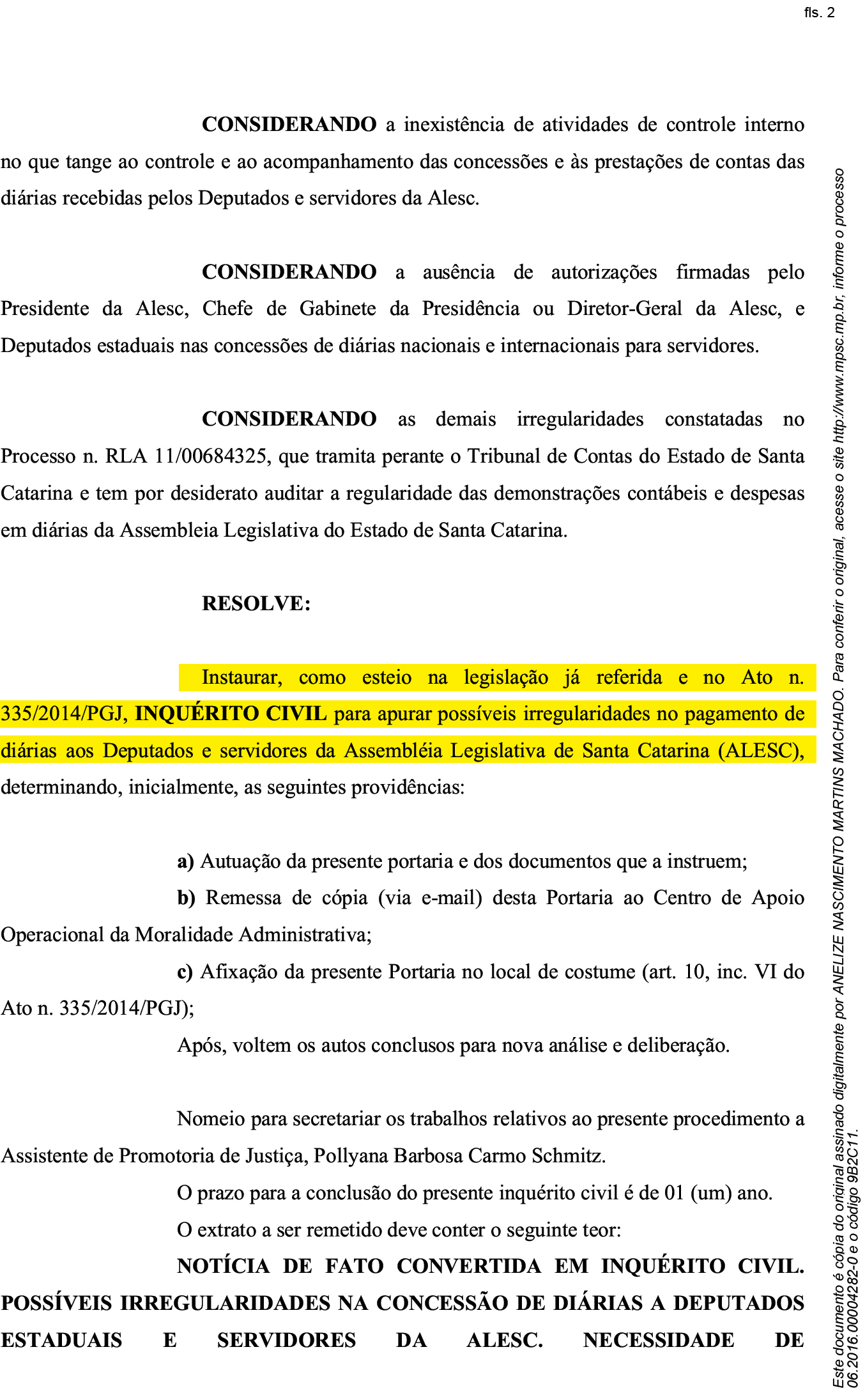 12a Promotoria de Defesa da Moralidade Administrativa da Capital e posteriormente encaminhada à Procuradoria Geral de Justiça (PGJ) do MPSC. Desde 2011, seria a terceira vez que uma denúncia sobre diárias chegava à Procuradoria. Nos dois primeiros casos, houve abertura de inquérito com posterior arquivamento. O último gerou a instauração de uma notícia de fato à parte para investigar ações do deputado Gelson Merisio. O caso foi arquivado em setembro de 2016.