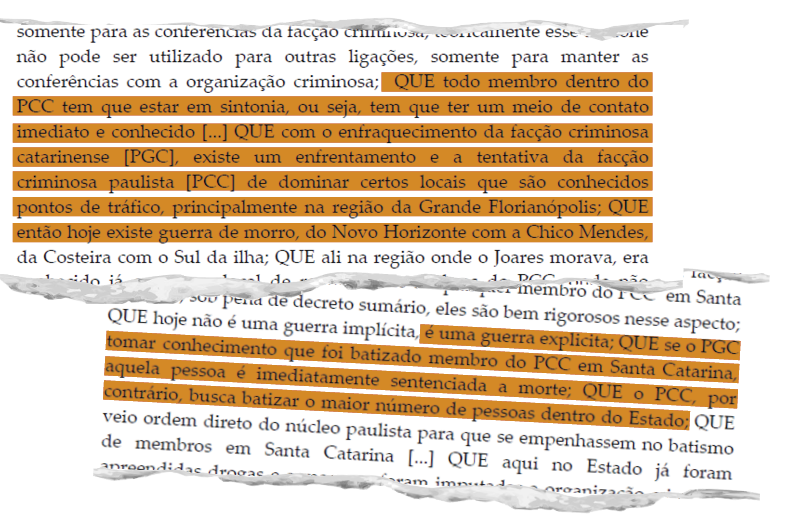 Existe a chegada de um novo grupo criminoso em Santa Catarina. Isso é bem forte na região da comunidade Chico Mendes com a Novo Horizonte (parte Continental de Florianópolis). Existe ali uma disputa muito grande de poder entre as facções e isso acaba resultado em vítimas fatais. Também há problemas no Morro do 25, no Morro do Horácio.