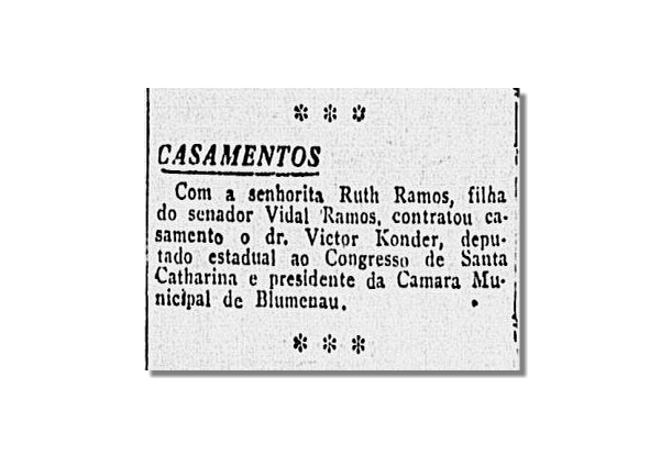 Os dois principais jornais da Capital deram a notícia. O Estado no dia 26 de janeiro de 1920, o República no dia seguinte: Ruth Ramos, a filha de 19 anos do senador e ex-governador Vidal Ramos, estava noiva do deputado Victor Konder. A importância das famílias na sociedade catarinense fez a novidade ecoar até à imprensa do Rio de Janeiro, capital da República, onde o tradicional Correio da Manhã deu a nota exatamente um mês depois.