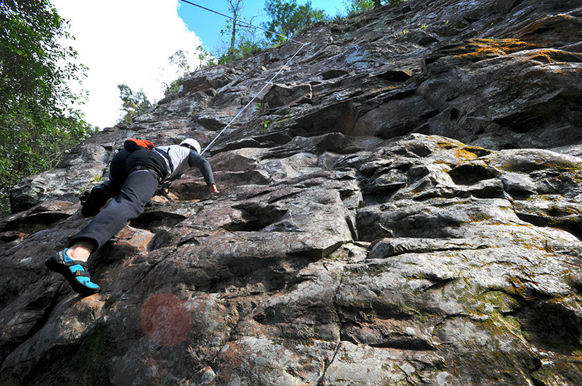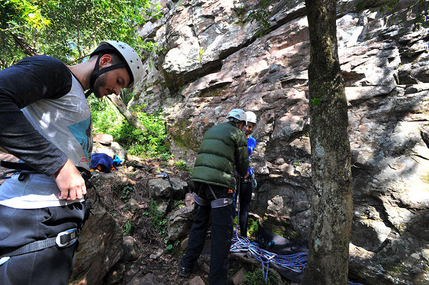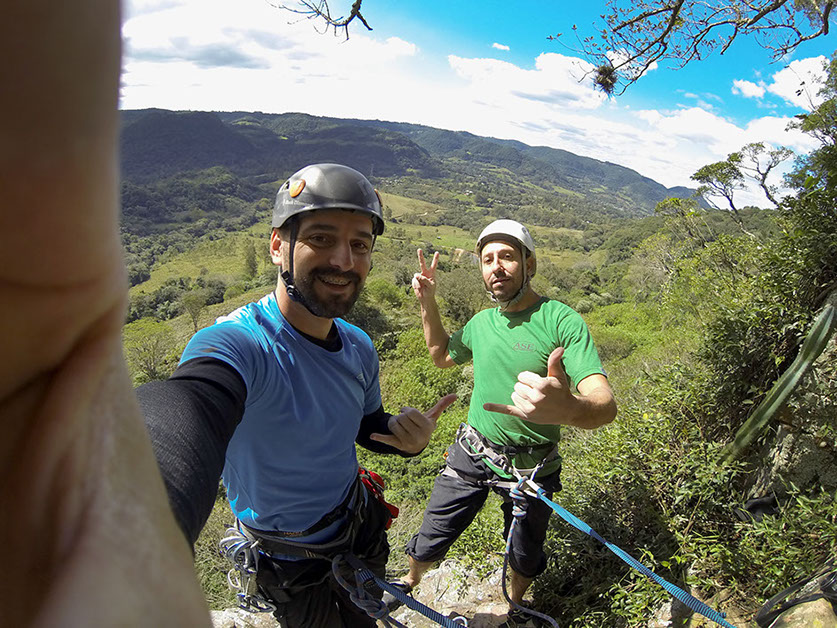 Respirar fundo, concentrar-se e seguir, mãos na pedra de cima, pés na fenda da rocha e impulso para o alto. Depois de quarenta minutos, concluímos com êxito nossa escalada, um esporte do mais puro contato com a natureza, um sentimento de superação e uma felicidade que se esparramavam por todo o vale.