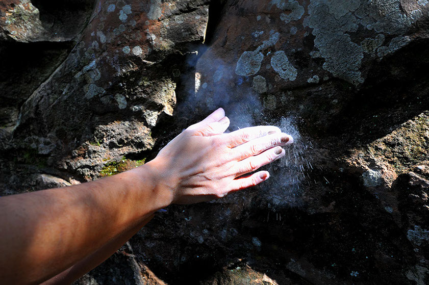 Wendel começa a subida mostrando todas as pedras, apoios de pés e mãos, assim como as fendas na rocha que eu iria usar para escalar a via. Chegou a minha vez de começar a subida. Antes disso, encho as mãos de pó de magnésio, para não ter perigo de resvalar, e vamos para cima. A subida é lenta: primeiro as mãos, depois os pés, prestando muita atenção nas orientações que vinham do guia que já tinha concluído a primeira etapa da escalada.