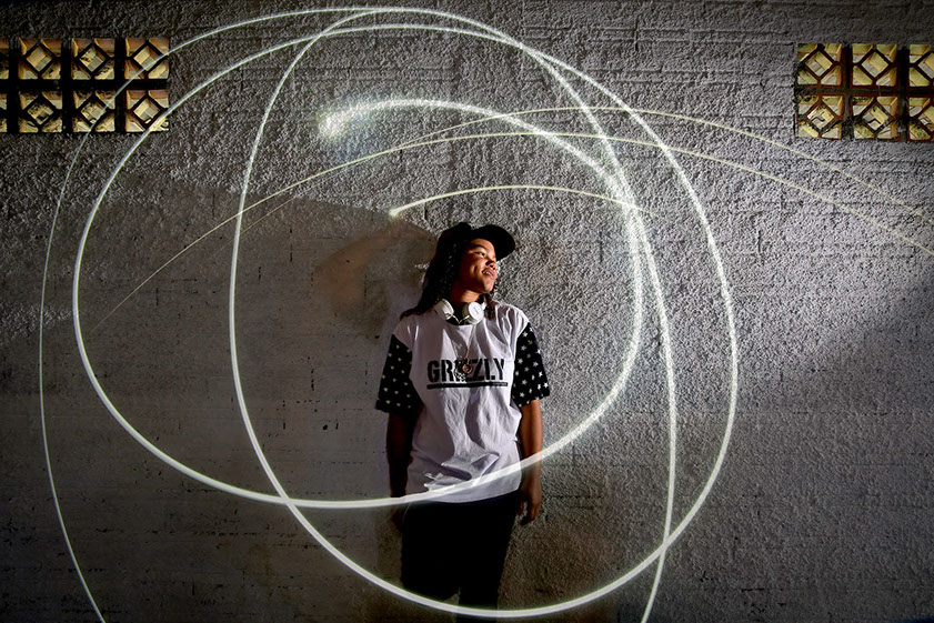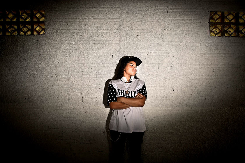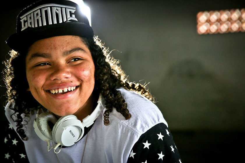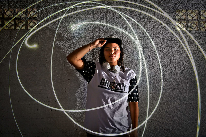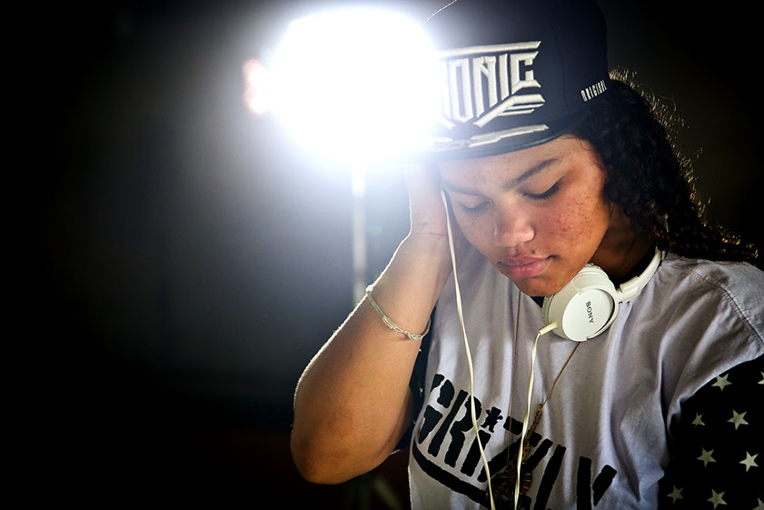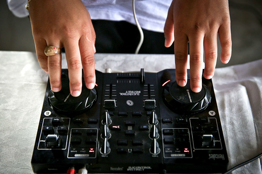 a batida do funk e do deep, a jovem Ana Carolina Boeno Cardoso, 13 anos, está descobrindo o seu lugar no mundo. Com o head phone nos ouvidos, atrás da pequena mesa controladora e um notebook, ela se transforma na DJ Boeno e coloca todo mundo para dançar, seja na pista, nas ruas ou no galpão do Centro Cultural Eleandro Alfen, a poucos metros do Conjunto Habitacional Marlene Moreira Pierre, onde vive no bairro Pachecos, em Palhoça.